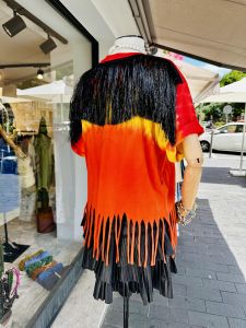 Une robe à franges, une baby doll à lèvres rouges, une pièce hybride entre cuir, flammes et poésie. Chaque modèle est pensé dans l’instant, avec ce que j’ai sous les yeux et ce que j’ai dans le cœur. Une jupe plissée vient flirter avec une coupe destroy. Des imprimés vintage embrassent des tissus pop. C’est instinctif, brut et très personnel.