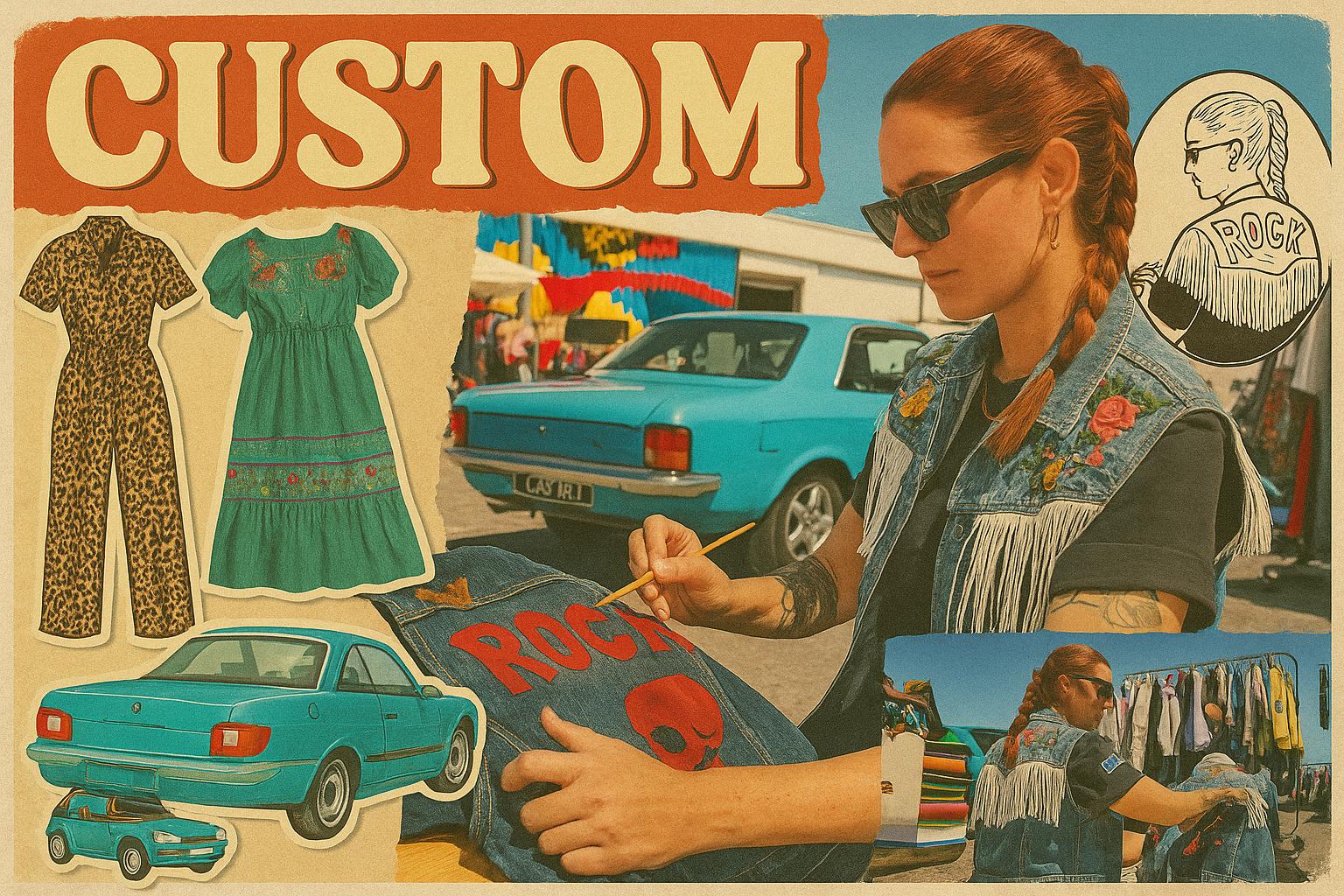 Je travaille seule dans mon atelier, entourée de tissus, de vieux patchs et d’idées en cascade. Chaque pièce porte un peu d’histoire : celle du t-shirt que j’ai trouvé, celle de mes influences chicanos & rock’n roll, et celle d’une femme qui crée sans filtre.