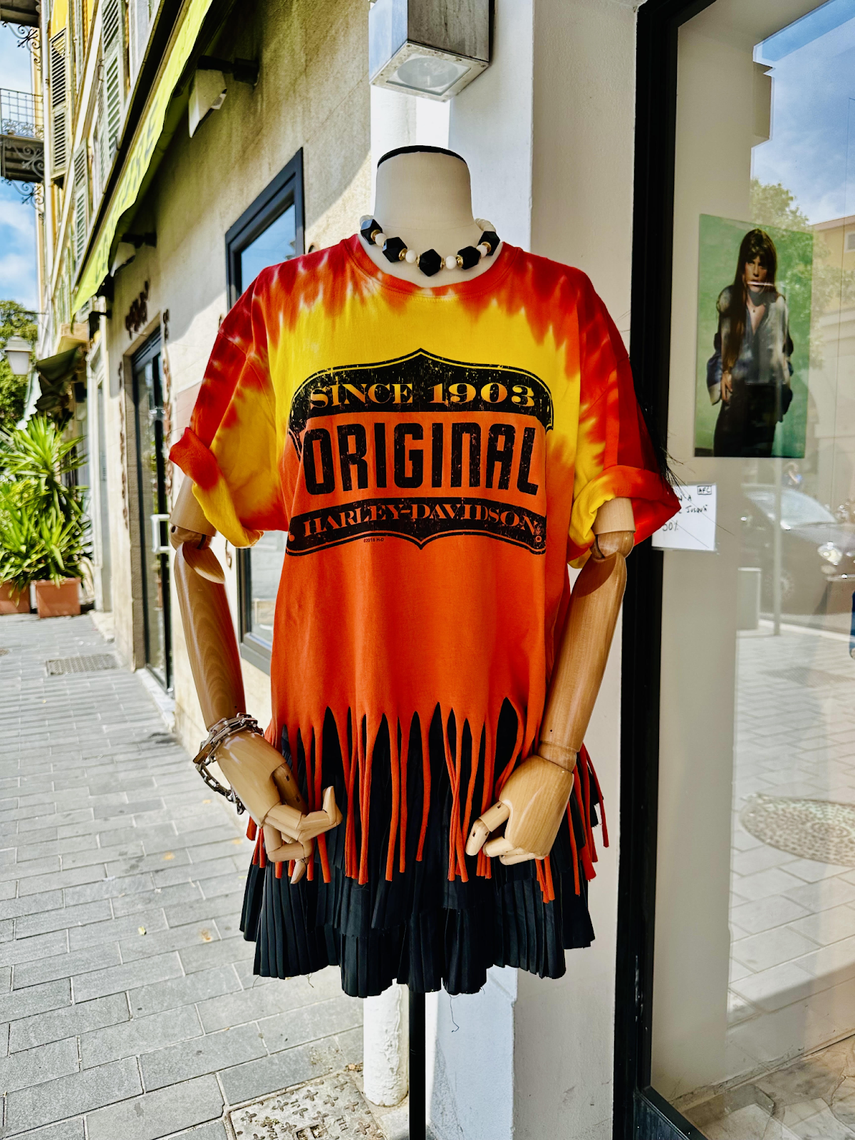 Chez Bonjour Madame, rien ne se perd, tout se transforme. Je chine mes t-shirts Harley Davidson comme d’autres cherchent des trésors : avec passion et obsession du détail. Une fois entre mes mains, ces t-shirts deviennent bien plus qu’un simple haut à logo. Ils se métamorphosent.