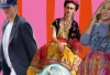 À gauche, une silhouette fluide, précieuse, presque mystique. J’ai choisi une jupe longue gaufrée, lamée dorée, que j’ai associée à des platform shoes Yves Saint Laurent — pour la hauteur, la puissance, le glamour. En haut, un petit maillot de bain noir Giorgio Armani, glissé sous une chemise homme Givenchy oversize à fleurs. En bijoux, un gros collier en résine volontairement vintage, et un petit sac berbère en argent pour l’esprit nomade.