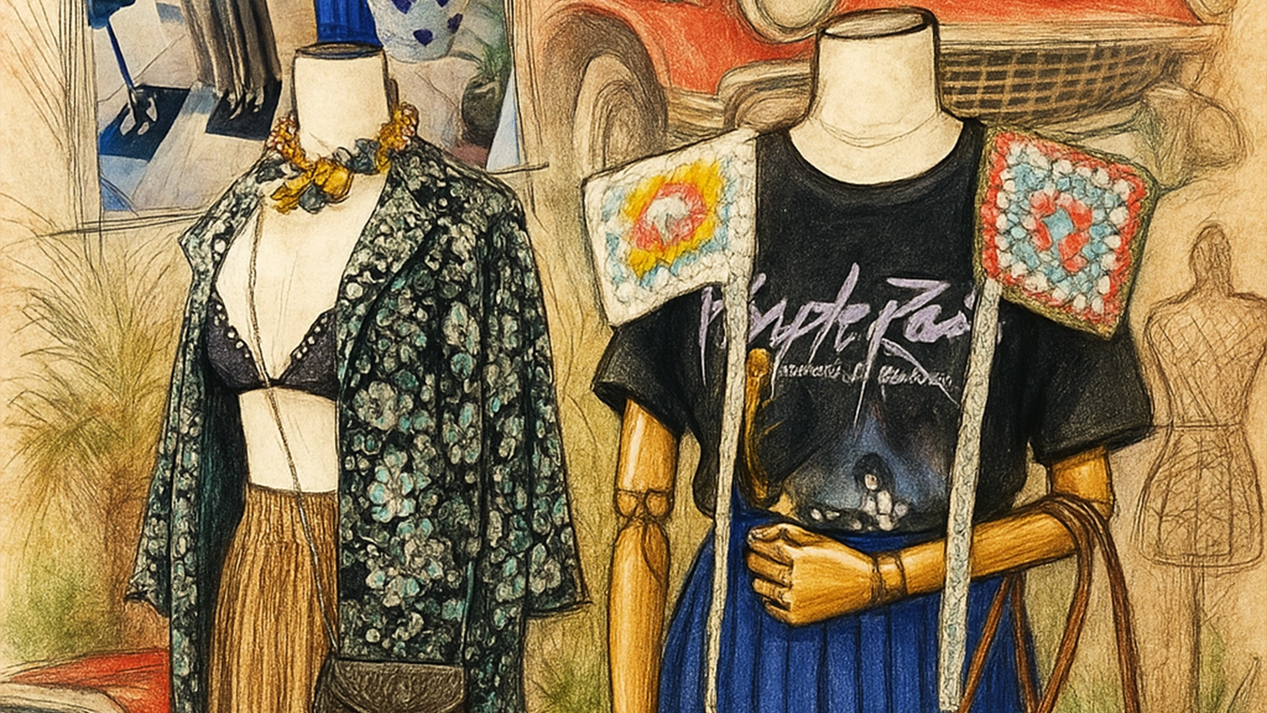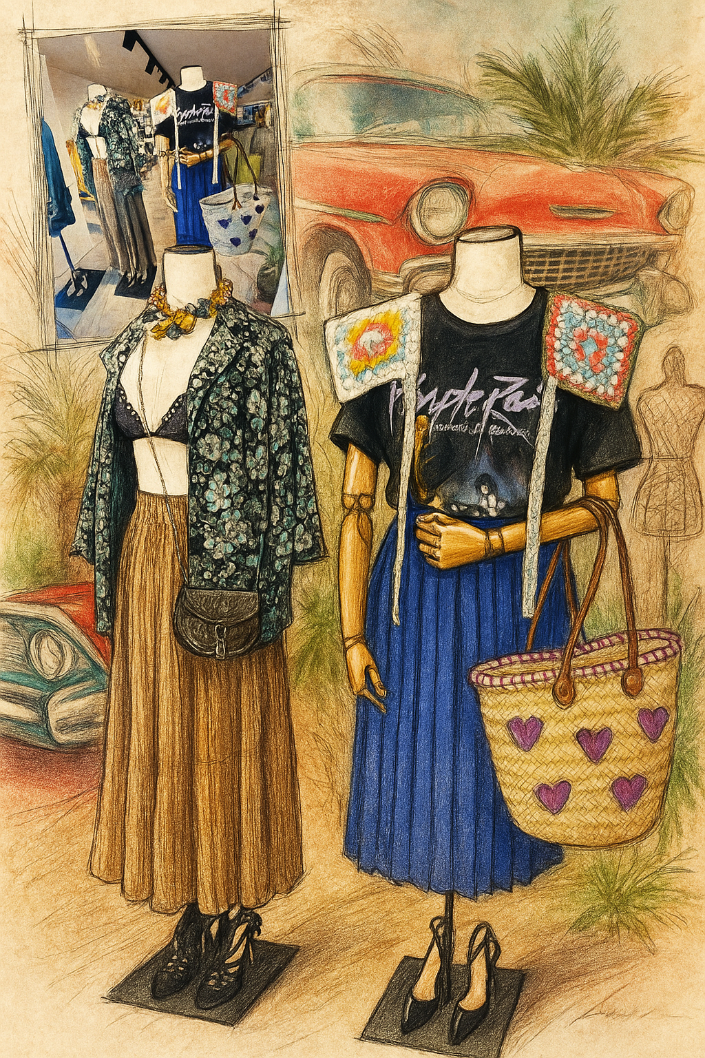 Pour cette vitrine, imaginée à l’occasion d’un vid-dressing entre copines, j’avais envie de composer deux silhouettes fortes, contrastées, presque comme deux personnages qui se rencontrent. Chacune a son langage, ses références, mais ensemble, elles racontent ce que j’aime : mixer les styles, les époques, les origines.